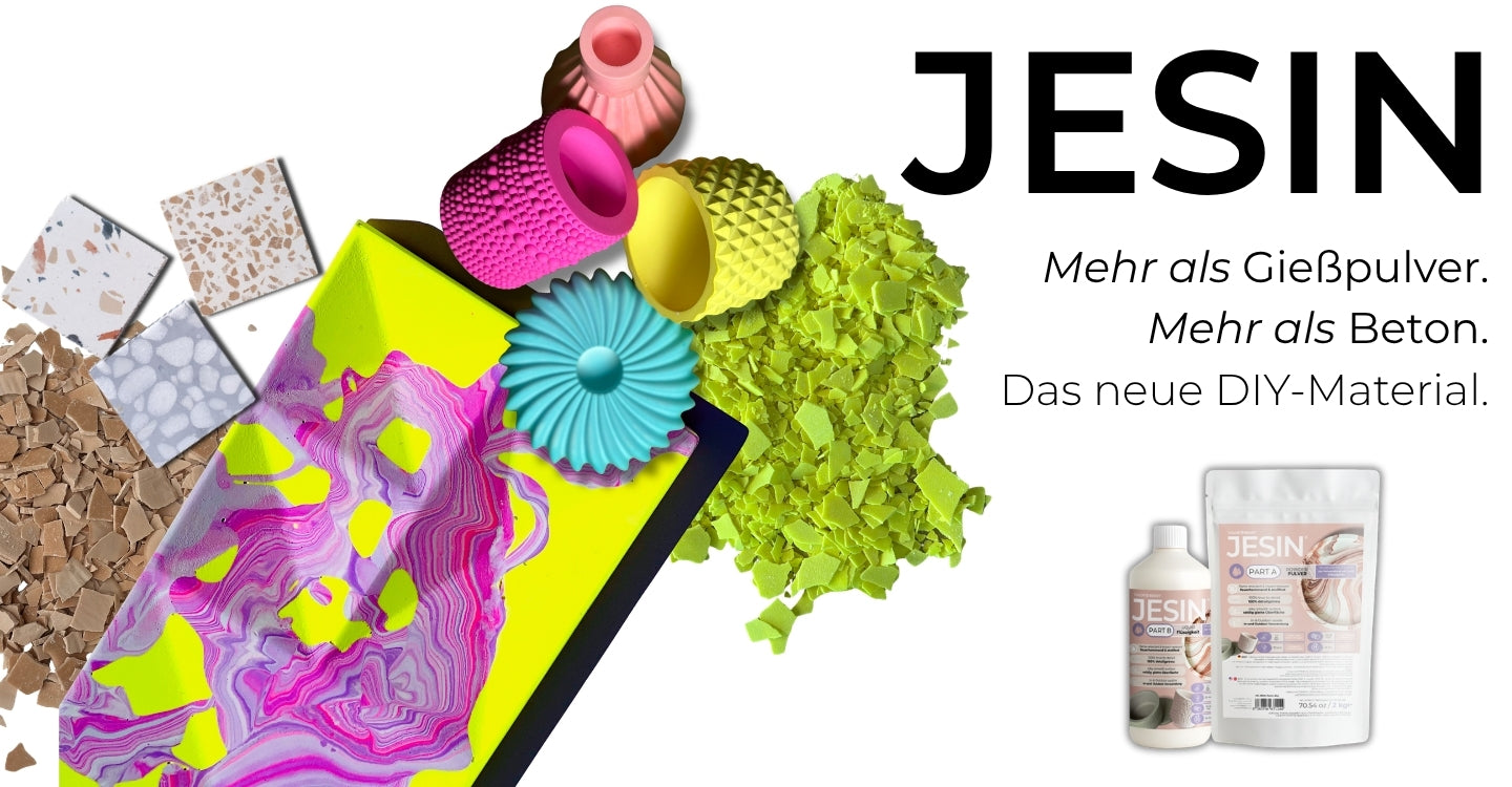 JESIN ist ein einzigartiges Gießpulver das Gießpulver und Beton vereint. Im Vergleich zu klassischem Gießpulver härtet JESIN in nur 20 Minuten aus, ist bruchsicher, intensiv einfärbbar ohne Ausbluten und ungiftig. Klassisches Gießpulver ist oft spröde, schwer einfärbbar und braucht deutlich länger zum Aushärten. Außerdem hat es eine beachtliche Verarbeitungszeit von 20 Minuten, wo kaum ein anderes Gießprodukt mithalten kann.